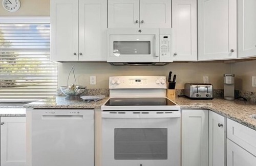 Step inside to discover a bright, beautifully remodeled interior with an open-concept layout designed for comfort and ease. The living area features stylish coastal décor, plush seating, and large windows that let in plenty of Florida sunshine. The updated kitchen boasts stainless steel appliances, granite countertops, and everything you need to prepare beachside breakfasts or relaxed evening meals at home.