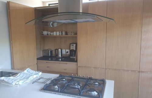 Fully equipped kitchen with gas stove, gas oven, microwave, large refrigerator, freezer, dishwasher, coffee maker and kettle