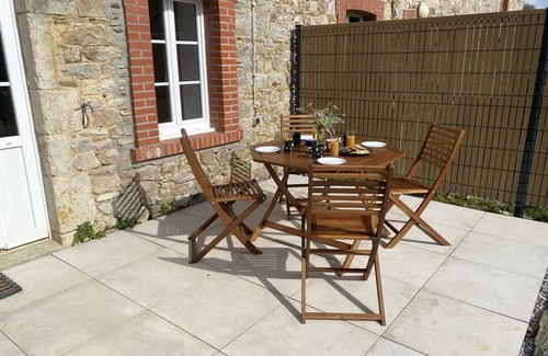 House adjoining the owners. On the ground floor: Living room with sofa bed (TV, Internet access). Kitchen open to the living room (induction hob, espresso machine, electric oven, microwave, dishwasher, fridge-freezer). Technical room (washing machine). Upstairs: a mezzanine bedroom ([hidden]x[hidden] bed and a fireside chair) and its adjoining bathroom with WC (sink and shower). 3 ha unfenced land. Gravel courtyard for vehicle parking. Private enclosed garden. Terrace. Private spa available all year round. Garden furniture. Parasol. Heat pump heating. All charges included. Sheets and towels provided. Cleaning included. Baby equipment on request. Possibility of accommodating horses (shelter and paddock). Pets accepted, limited to one animal per stay (supplement). The owners of this former farmhouse dating from [hidden] wanted to pay tribute to "Camille," a little girl who lived in this house and who carved her name into a brick during renovations at the beginning of the 20th century. It is in this green setting and in the Cotentin countryside that Mathilde and Matthieu have breathed new life into this home, and today offer you a peaceful stay... A real highlight of your stay: the private spa, which will offer you a moment of relaxation and undeniable well-being. The accommodation can accommodate 2 or even 4 people (extra beds available). Numerous walks in the surrounding area will delight hiking enthusiasts. The "La Gloire" river flows near the cottage, providing the soothing sound of water. Not far from the RN[hidden] km), you can also discover the many tourist attractions in the surrounding area: Barfleur, Saint-Vaast-la-Hougue, the D-Day landing beaches, and many others.
