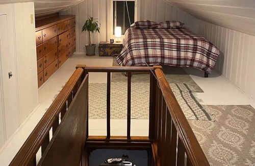 There are two bedrooms off the living room. The main bedroom has a queen bedroom and bathroom, while the second bedroom is smaller with a single bed (with trundle), baby crib and chest of drawers. The third bedroom is in the attic with a queen bed and has the space to have another blow up mattress if needed.