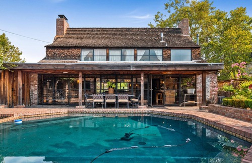 The house is uniquely divided into two spaces, separated by a charming courtyard and pool. In the main house {2 story}, you will find the master loft bedroom, kitchen, with an open area downstairs. The second one-story building (1100. sq ft) has two bedrooms, a sitting area, with 2 fireplaces. and 1.5 bathrooms.