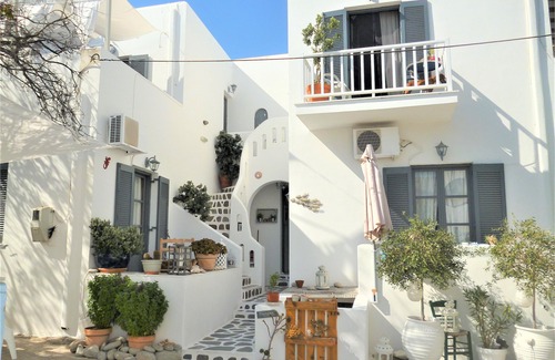 Located in Parikia, the main port of the island of Paros and at the end of a quiet dead end street (last house on a dead end street).