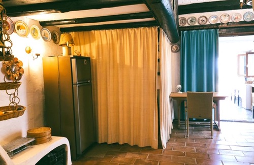 The living area has a sofa bed, a large fridge, as well as a square table that can also be used for meals.