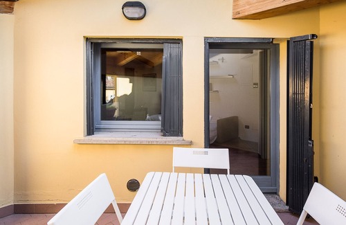 The apartment is situated on the third floor of an historical building, with no lift. The entrance opens to the open space living room featuring wooden flooring and enriched by exposed wooden beams, furnished with a comfortable double sofa bed and a flat-screen TV. In this room there is also a new and well-equipped kitchenette, fitted also with a microwave, a coffee machine and a dining table for four people. The bedroom, bright and cosy, comes with a walk-in closet and a queen size bed. The full bathroom has been recently renovated and comes with a wonderful large shower. A balcony overlooking the rooftops of Bologna completes the apartment, coming with a table and chairs to enjoy breakfast outside during sunny days.