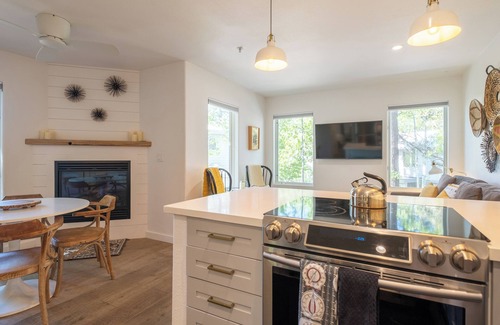Step into a sun-filled retreat with soft, neutral tones, comfortable furnishings, and modern finishes. The living area is open, inviting, and perfect for relaxing after a day at the beach or on the slopes. Enjoy movie nights on the mounted flat-screen TV or curl up with a book by the cozy fireplace.