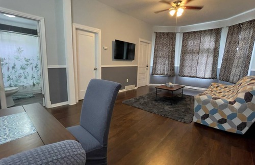 Open floor plan apartment with 2 bedrooms, 1 den/office with desk. Located in a quiet and clean family-oriented neighborhood (Hermosa). Great place to stay to attend one of the many concerts and festivals in the Chicago area. Short drive or bike ride to nearest 606 entrance. Cermak grocery store 2 blocks down. Aldi, Burlington, Cook Brothers, and Dollar Tree also close by. Futon and Queen mattress also provided for additional guests.