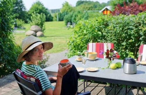 The extensive grounds include a playground with a slide, swings, playhouses and a large play area. Plenty of space for sunbathing or relaxing with a good book. The large, partially covered barbecue area is available to all guests and not only offers protection from a shower, but you also have a view of your children playing - and in the evening the golden sunset over the hill of Moritzhagen.