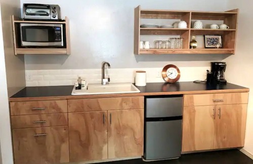 You have the downstairs to yourselves. Entrance is just through the main entry to the house. Two bedrooms with double beds. Kitchenette has induction burners, toaster oven, microwave, coffee machine, and fridge freezer. Cookware and plates, glasses and utensils are provided. Table extends in the dining room to seat 6. Laundry is available, shared. Access to outdoor spaces is through the upstairs.