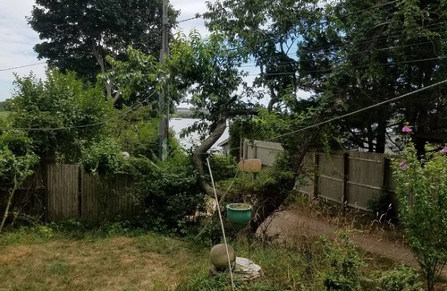Charming, low key, tranquil one-bedroom beach cottage set around lush courtyard back from shore of Fort Pond with glimpse of ocean past it