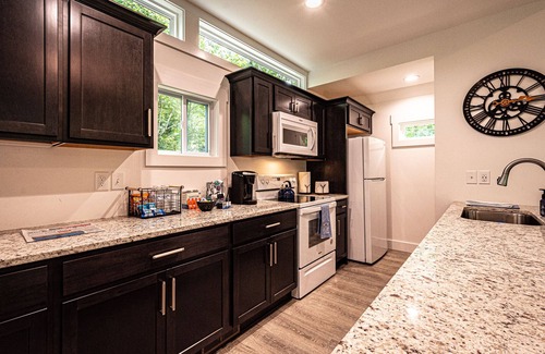 Escape to this charming 2-bedroom, 1.5-bath vacation home that feels like a treehouse nestled in the North Georgia mountains. Dog friendly! Perfect for a relaxing getaway, this unique retreat combines modern comforts with the warmth of Dahlonega’s local charm. Blue Door, Dahlonega provides a comfy and clean home base for your special occasion or relaxing getaway.
