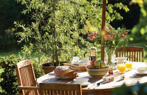 Outside, the terrace provides garden furniture for alfresco dining whilst enjoying views of the delightful, mature and generous surrounding gardens and fields. The adjoining field has a soothing pond, perfect for picnics or quiet contemplation. Within the gardens are various spots to sit and enjoy the planting and terraced trees, and a sculptured sphere adds to sense of grandeur; or escape to the fun shepherd's hut with a good book and a glass of wine.