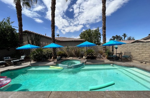 Welcome to The Coachella Oasis. Have fun, relax with friends and family while enjoying the breathtaking mountain range view of the Coachella Valley. Enjoy your own private pool and hot tub. Our home is a 2 Bedroom / 2 Bathroom. Each bedroom has king beds. Our living room / common space has a queen size murphy bed and a futon/couch. Plan your desert getaway in this bright and updated home located within the gated Indian Palms Country Club - an ideal location 1.5 miles to Coachella/StageCoach festivals - as well as Empire Polo Club, BNP Paribas Tennis, PGA golf tournaments, dog/horse shows, art festivals, shopping and restaurants.
