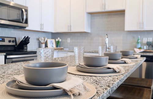- Gorgeous kitchen with beautiful cabinetry, stone counters, stainless appliances – fully stocked and equipped for meals at home