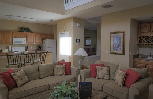 Upon entering, you will find a formal living and dining area which leads into the open plan living and kitchen area where there is a dining table that seats 6 and a good size living area with comfortable sofas from which you can watch TV or look out to the lanai. The kitchen comes full equipped with a breakfast bar area for those quick morning bites before you hit the theme parks.
