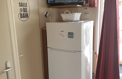 A semi-covered wooden terrace of 15 m² and lit for your evenings. It is equipped with a gate for the safety of children, a table, 6 chairs, an umbrella and a clothes horse. A secure key box will allow you to access the mobile home in case of late arrival.