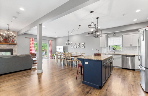 Step inside to a patriotic showcase of red, white, and blue decor, filling the home with vibrancy and warmth. The fully equipped kitchen with two ovens is ready for your culinary creations, whether you're cooking up a feast or indulging in a gourmet meal prepared by a private chef -- ask us for our favorites! Gather around the large dining table to enjoy delightful meals or a game of cards creating lasting memories. Relax and unwind by the double-sided fireplace, perfect for cozy movie nights in the inviting living area. The main level deck offers stunning lake views and the coziness of a fireplace, ideal for sipping a refreshing beverage. Boasting 5 bedrooms, 5 full bathrooms, and 2 additional half bathrooms, providing ample space for families or groups.