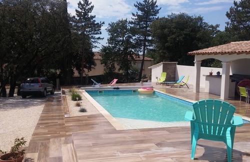 Contemporary house with a large swimming pool on the edge of a village in the south of France, located in a peaceful environment ten minutes walk from the shops, 500 m from the bike path.