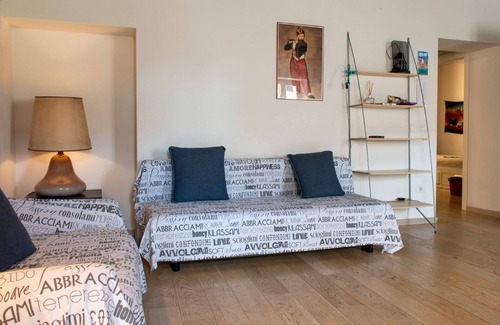 A delightful three-room apartment furnished with care and attention to detail, located in the heart of the historic center of Portoferraio, directly on the main square. On the first floor of an ancient building, a blue door welcomes guests and leads into a large, very bright living area. The ancient beamed ceiling makes the atmosphere very welcoming. It has no private parking, but public parking lots are about 600/700 meters away. Directly under the house a large paid parking, free from 8 pm to 8 am. A stone's throw away characteristic shops, elegant boutiques, bars and restaurants. On foot you can reach two of the most beautiful beaches of Portoferraio Le Viste and Le Ghiaie. Well connected by public transport to reach the other places on the island.