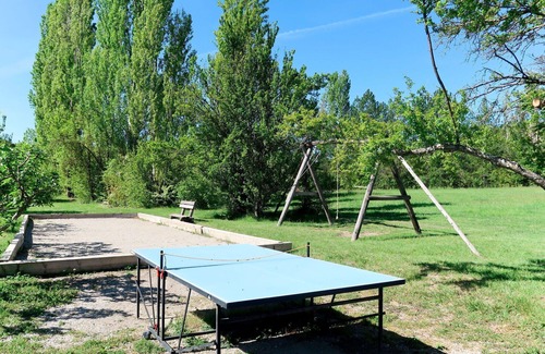 Chante l'Oiseau is a beautiful and cozy country house situated at an altitude of 500 meters, surrounded by trees and meadows. It offers 12 apartments within the residence, providing an ideal holiday rental for those seeking a serene and natural escape. The property boasts a shared 6-hectare area with a lawn, trees, and a natural garden, complete with a natural pond and a stunning seasonal swimming pool (13 x 5 m), available from April 15 to October 7. Additionally, you'll have access to various amenities, including a table tennis area, a boccia court, a pergola, a terrace (60 m2), and garden furniture.