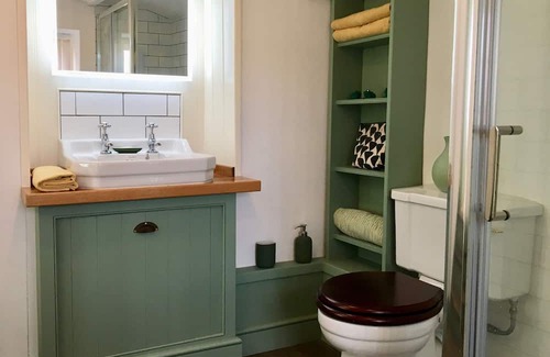 Through the bedroom is the light and airy bathroom with electric shower, extra large shower cubicle, basin cabinet, Demister mirror with shaver socket, infra-red heater with towel rail, hand-built shelving, WC and another lovely view into the river.