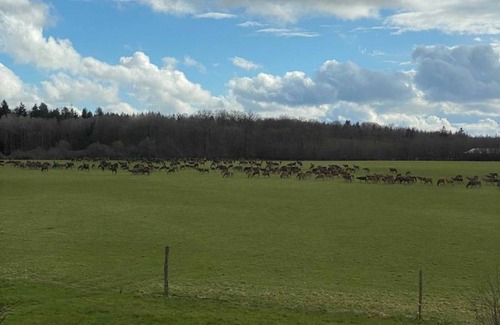 This cottage is not available for hunting activities. Unique: L'Hôtellerie du Brame is a fully restored country house in the heart of the Pays d'Auge region, surrounded by greenery and in the immediate vicinity of the Saint Evroult forest, home to majestic wildlife that you can safely observe from the cottage, offering fascinating encounters with animals in their natural habitat. At nightfall in September, let yourself be captivated by the stag's bellow! The Pays d'Auge, renowned for its bucolic landscapes, apple orchards, and equestrian traditions, is the perfect place for those wishing to discover the authentic charm of Normandy. In addition to picturesque villages with half-timbered and brick houses, the region is famous for its cheeses, notably the renowned Camembert, and its cider. If you enjoy hiking, local history, or simply the peace and quiet of the countryside, this house offers an ideal base for exploring the region and a unique and tranquil living environment.