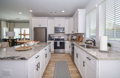 This home will sleep 8 comfortably with 2 king sized beds and 2 double beds. You will have coffee capsules provided for a Keurig, 2 smart TVs, high speed internet, a gourmet kitchen to prepare wonderful meals, a charcoal grill with a lovely back patio, and parking for 2 vehicles in the driveway. This home is pet friendly for 2 dogs only. Also, this home features a fenced-in backyard!