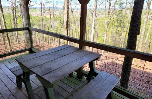 OUTDOOR FEATURES: Enjoy a large covered deck along the entire length of the cabin with 2 rocking chairs and a picnic table that overlooks the forest, horseback trail, Prairie Bayou valley and Jack Mountain. An outdoor, park-style, grill with limited grilling amenities is great for outdoor cooking. Enjoy time around the fire of the fire pit (limited firewood provided). A separate uncovered picnic table is available near the grill and fir pit for dining in nature.
