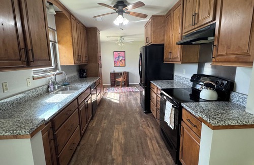 Escape to the Cowgirl Casa, a beautiful ranch style house in picturesque Montrose, the gateway to the San Juans. With 3 cozy bedrooms including 2 queen beds and 2 twin beds. The home has 2 bathrooms one with a bathtub shower combo and one walk in shower. This perfect retreat is ideal for guests seeking a relaxing getaway. Our place is equipped for both long or short stays to make your holiday or work trip one to remember. The home is one level with an entrance ramp and shower bars, making the space ADA accesible. The backyard has a playscape for the kiddos and dog run for the pups! Designated workspace and WiFi, a fully equipped kitchen, dining space and living room with 75in tv make this the perfect home away from home. Come take your boots off and stay a while.