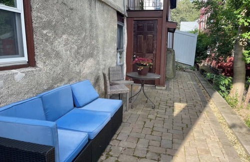 Private 1BR unit set off the road with a peaceful outdoor patio. Features a comfortable bed, full kitchen with stainless stove, Wi-Fi, 42” TV, window AC, washer and dryer (mostly yours), and BBQ grill. Ideal for couples or solo travelers seeking a tranquil Brookline stay. Pets allowed. Refundable $100 security deposit required.
