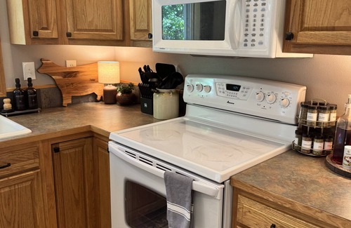 This 2-bedroom, 2-bathroom home tucked in the trees offers comfort, charm, and all the essentials for a relaxing stay. The master suite features an ensuite bathroom and large closet for added privacy and convenience. Cook up your favorite meals in the fully stocked kitchen with a full-sized fridge, oven/range, microwave, coffee maker, toaster, and more. Gather around the dining table or head outside to the back deck for al fresco dining and grilling on the gas BBQ. In the evenings, curl up on the comfy couches by the gas fireplace or enjoy a movie night on the smart TV with your favorite streaming service or DVD. With puzzles, books, and board games, there’s always something to do indoors also.