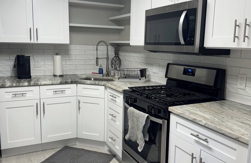 Perfect for families, groups, or small gatherings, this spacious rental features 3 queen beds, 1 full bed, and 1 single bed, comfortably accommodating up to 9 guests. There’s also a cozy love seat and a sectional couch with two reclining ends, providing the ideal spot to relax after a day of exploring. With 2.5 bathrooms, getting ready for the day or unwinding in the evening is a breeze.