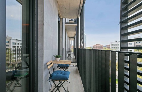 The apartment stands out for its modern industrial-chic style, making it an ideal space where design and high-quality materials come together to create a true home away from home.