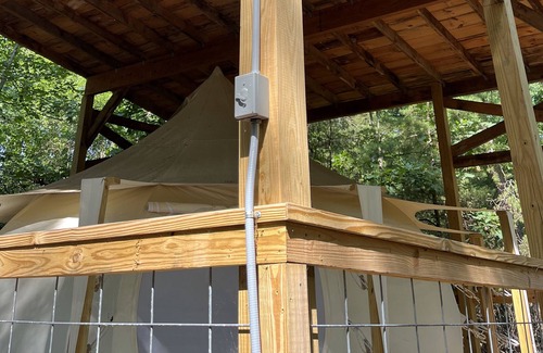 Come and relax in a cozy belle tent on a beautiful 32 acre private farm. The belle tent in the oaks offers a private retreat feel with comfy queen bed, a cafe table and chairs, a full beverage station with coffee, tea and water. The belle tent also includes a private bath house with composting toilet, and a nice hot shower. The outdoor covered sink is perfect for hand washing, teeth brushing and dish washing. The belle tent is situated on a covered platform that has outdoor seating and lighting. There are lamps and fairy lights in the tent as well as a power block to plug in phones. Enjoy an evening around the community fire pit! While quiet and private you are just 1 mile to downtown Landrum, minutes to Tryon, Columbus, TIEC, FENCE and countless restaurants. There is beautiful hiking close by as well as a 1/2 mile walking trail right here on the farm!