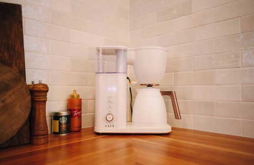 Kitchen: The heart of the cabin, the kitchen boasts butcher block countertops, stainless steel appliances, a farmhouse sink, and an oven with an air fryer. The custom-made range hood, crafted from reclaimed wood, adds a rustic touch.
