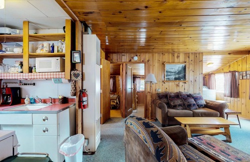 The kitchen and dining room are both adjacent to the living room. The pine dining table can seat six people comfortably for family dinners. The kitchen is small but very efficient and is complete with a four-burner stove/oven, refrigerator, microwave, sink, and all the essentials you need for preparing meals. Just bring food, friends, and family!