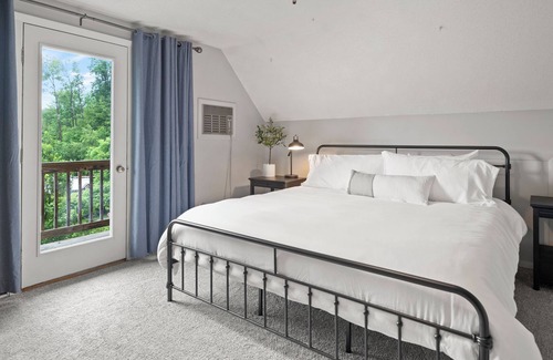Bedroom 2 - upstairs with a king bed, A/C, desk, and porch