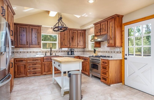 The spacious kitchen is fully equipped with granite countertops and modern stainless steel appliances. The living room offers two comfortable couches, bar seating, and warm pine accents, with views of the seasonal creek. Relax by the fireplace or enjoy entertainment on the 65” Smart-TV.