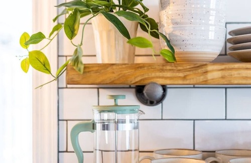 KITCHEN: Our kitchen comes fully stocked with plates, cups, mugs, coffee-maker and a French press. Please enjoy some complimentary coffee, tea or hot chocolate. You will also find cookware and cooking utensils. We have provided child friendly cups and plates as well inside the cabinets. The island comes with two bar stools and there is a breakfast nook right off the kitchen for you to enjoy some morning meals.