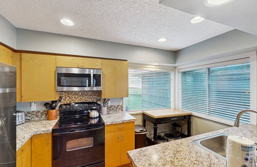 Just off the living room is a wood dining room table for six, perfect for a family potluck or holiday feast! The fully-equipped kitchen is a chef's dream with granite counter tops, a breakfast bar with three barstools, and a French-door refrigerator.