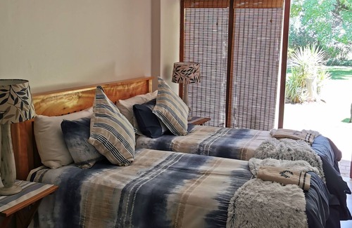 This room has a large double room with a king size bed / twin beds and in addition a single bed with en-suite shower and toilets, coffee/tea facilities, bar fridge, microwave and 32 “ flat screen Tv with a Dstv decoder with the hospitality bouquet which include 9 movie channels, all super sport channels, Sabc channels and E-tv. You also have your own private entrance with beautiful view over the garden and close to the swimming pool.