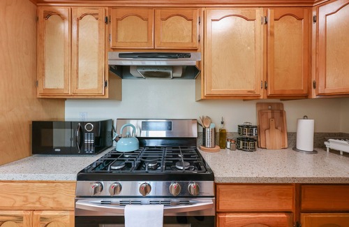 Enjoy a fully stocked kitchen with all of the essentials you may need. Kitchen comes equipped with a full sized refrigerator (no ice maker), stove/oven, microwave, toaster, rice maker, waffle maker, Keurig coffee maker, coffee pods, blender, pots/pans, bakeware, utensils, and spice rack.