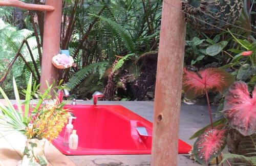 This 2 bedroom, 1 bath cottage is located at the bottom of a 6 acre parcel in the middle of the forest. The master bedroom has a king size bed, the second room has a Queen bed and there is a trundle bed in the living room. The ceilings are open beam cedar, the floors are bamboo and stone and the cottage has many custom details. The bathroom has a large custom walk in shower. Outside there is a covered lanai with a nice table and seating as well as an outdoor soaking tub surrounded by flower gardens and forest. Private and secluded but 10 minute drive to the beach 15 into Kona town