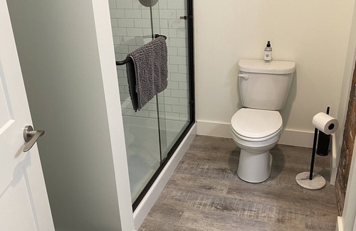 Full Bathroom: white subway tiles in the shower with dark oil rubbed bronze hardware and a rustic latter for hanging towels. We provide you with shampoo, conditioner and soap to allow you to forgo having to check your luggage at the airport.