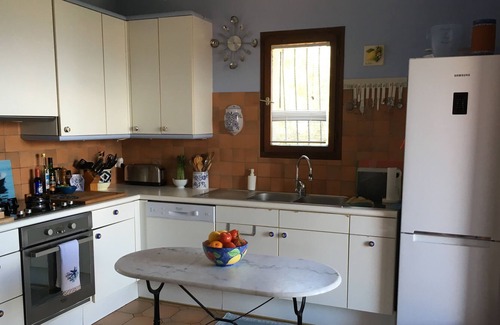 This five-bedroom villa was custom-built to provide spectacular panoramic views from both the wrap-around terrace and the large private pool in the garden. The unobstructed views from terraces go beyond the sandy local beach and rocky headlands of the coast, across the Bay of Ajaccio towards the majestic mountains that dominate the center of Corsica. This comfortably furnished and well-equipped villa has wide covered and uncovered terraces and ceiling fans in every room. The villa’s Terrace Level has cathedral-ceiling living and dining area , modern kitchen with BBQ terrace, toilet and master bedroom suite with full bath and private terrace. On the Garden Level below are the remaining 4 bedrooms with french doors that all open onto the garden with a large pool. A great family villa for up to 11 people. It is also well-suited for romantic rendezvous because the terrace level includes master bedroom with a private balcony; so a couple can enjoy living in a very spacious one bedroom unit. The villa is a 5 minute walk to the sandy beach at Portigliolo. This quiet, beautiful community on the southern tip of the Gulf of Ajaccio offers local tennis, boating and dining; just 17km to its main resort town Porticcio and 35km from Ajaccio Airport.