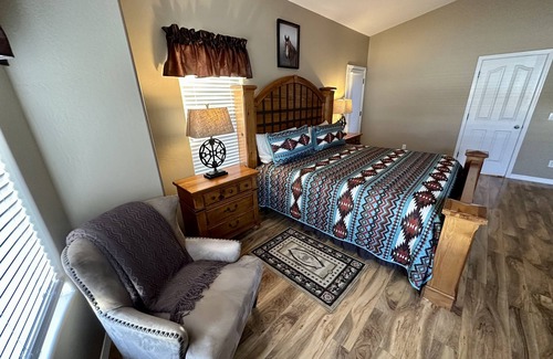 Come relax in this beautiful single level custom home! The houses in this neighborhood have generous spacing between them providing lots of privacy for your stay. You’ll enjoy the open great room concept with rustic bar (alcohol not provided), and a large eat in kitchen with every kitchen accessory you could possibly need as well as upgraded appliances. The spacious dining room includes a table that seats 8 comfortably. The pool area is recently remodeled with an extendef fence line, resurfaced pool deck, a pool heat pump, new patio sectional and lounge chairs, a 20x12 pergola, artificial turf and a paver sitting area. This rental is pet friendly for small to medium dogs, with a doggy door in 4th bedroom that leads to a fenced dog area. There is also 1/4 acre pasture behind the pool fence. The large driveway fits up to 8 vehicles. Garage use is not included in this rental. RV water, power and sewer available. Please contact owner for rates. The neighborhood has walking and bike paths accessible from every street.