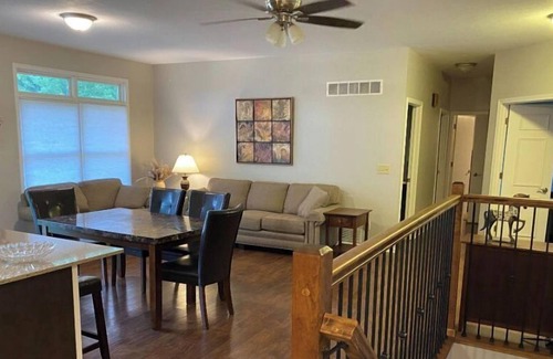 This walkout ranch on a quiet street is perfect for business, pleasure, and game day stays. You are welcomed with an open concept living room/dining room/ kitchen area. Attached to the dining room is a glass sliding door that leads out to an upper deck where you can sit out and enjoy a cup of coffee and lake view in the mornings. The main level also includes a large bathroom with double sinks, a corner shower and linen closets. Just to the left of the entry door is a bedroom with a closet, desk, and double bed. The second bedroom includes two double beds, a double closet, dresser, nightstand with lamp and desk. The master bedroom has a king bed set with nightstands, lamps, desk, dresser walk in closet and bonus closet. The fourth bedroom is in the walkout basement and includes 2 double beds, a dresser, closet, and desk. Relax in the nicely furnished basement bonus room which is adjacent to the conference area which seats 14 and is equipped with an overhead projector.