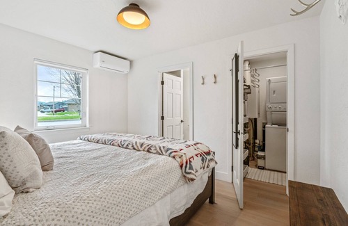 This lovely Parkside bungalow's main level features a fully equipped easy living kitchen with upper scale appliances, charming eating area, relaxing living room with cozy gas slate surround fireplace, television, full bath with tile surround tub/shower, a roomy one-bedroom with comfortable king size bed and en-suite 3/4 bath, walk-in closet and stacked washer and dryer.