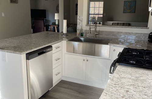 Our cottage at the lake is a great location for a family or couples getaway, girls only/guys only weekend, and only 45 minutes from Atlanta. It has 3 bedrooms—one with a brand new King, one with a brand new queen, and one with a twin-over-double bunk bed. The sleeper sofa in the family room is a full size, comfortably sleeping 1 adult or 2 children. The house sleeps 5 Adults and 2 Children comfortably. The brand new master bath has a large walk-in shower and the brand new smaller, hall bath has a shower. Both bathrooms have blue tooth speakers in the lights. Watch TV or your favorite movies on our Smart TV or DVD in the Family Room viewed from the most comfortable recliners ever designed. The keeping room and kitchen are flooded with sunlight in the morning and are the gathering place for family and guests while breakfast is prepared. Light the wood burning stove for additional atmosphere.