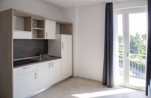 The 50 mq Deluxe Suite for two people has a double bedroom, fully equipped kitchen, private bathroom, satellite TV, air conditioning on consumption and a balcony. The furniture is modern and studied in every detail. Bed linen is already provided in the bedroom and you will find a comfortable courtesy set. The Deluxe Suite can be reached by a brand new lift. The Suite is modern and well-kept, furnished with design elements.