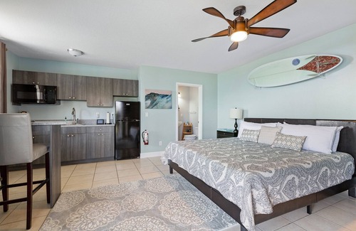 Direct Oceanfront unit on the ground floor with kitchen (refrigerator, microwave, two-burner range top, sink), dining area, King size bed, full bathroom (tub/shower combo), and patio. 43" Ultra HD Smart TV Hi-Speed WiFi Manager Note: Fall asleep to the crashing waves. In the morning, walk directly out to your patio area, ocean deck, or down to the beach in this conveniently located ground floor unit.